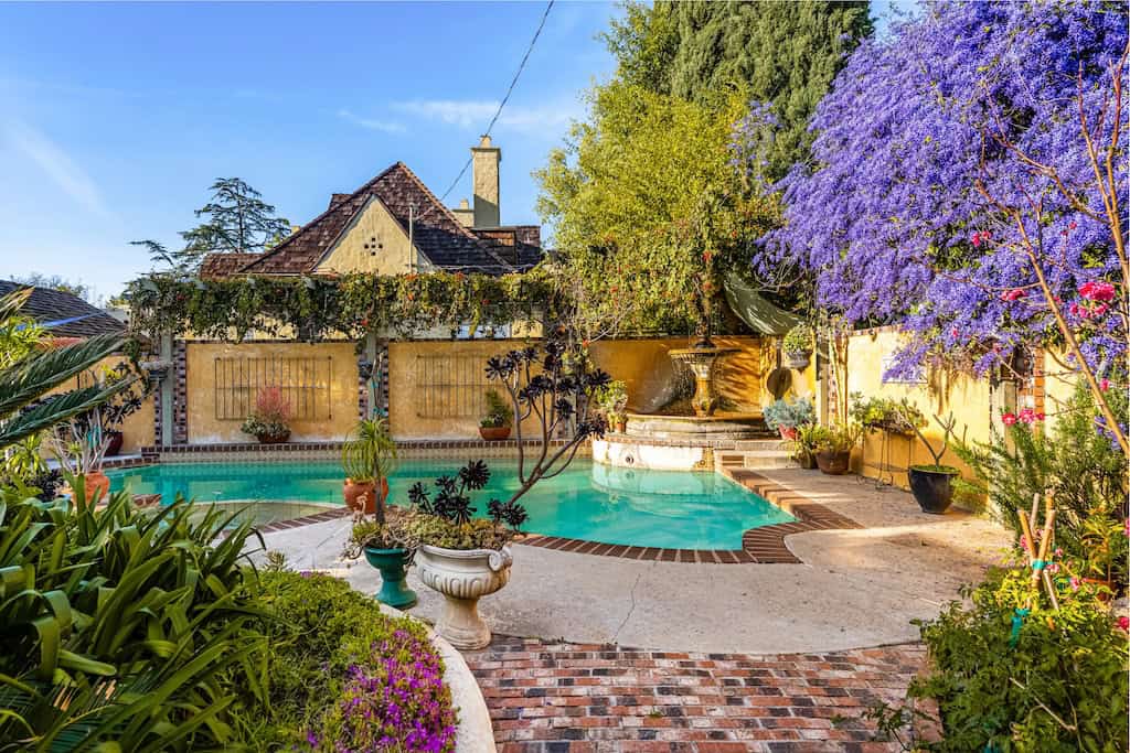 From the moment you walk through the door, you’ll feel the warmth of this home’s timeless design. The beamed living room is bathed in natural light from elegant skylights, highlighting the grand fireplace and offering serene views of the lush backyard. A cozy library, tucked away for peaceful moments, overlooks a courtyard with a soothing fountain, a perfect retreat for book lovers and dreamers alike.